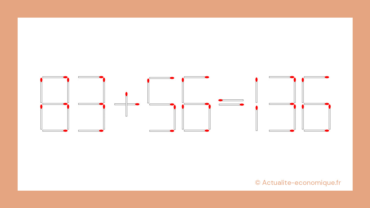 Voici le défi du jour : l’équation 83 + 56 = 136 est incorrecte. Votre mission, si vous l’acceptez, est de la rendre juste en déplaçant une seule allumette. Et attention, le chronomètre tourne : vous n’avez que 30 secondes pour trouver la solution !